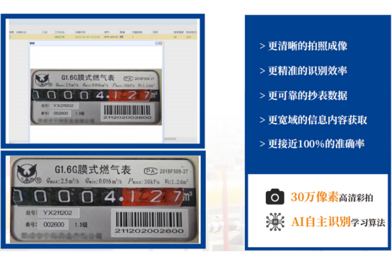 此方案采用柏誠先進(jìn)的AI智能圖像自主識(shí)別學(xué)習(xí)算法和搭配30萬像素高清彩拍,以加裝模塊的方式升級(jí)改造機(jī)械燃?xì)獗恚蛊渚邆渲悄艹磉h(yuǎn)傳的功能,每塊表的讀數(shù)自動(dòng)拍照上傳平臺(tái)識(shí)別并抄表記錄,只需動(dòng)動(dòng)手指頭,就可以輕松掌握和管理全域抄表數(shù)據(jù),徹底告別風(fēng)吹日曬雨淋人工抄表,不僅低成本實(shí)現(xiàn)智能抄表,還省時(shí)省力更輕松了。